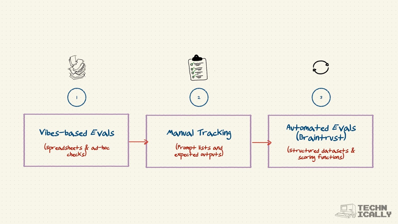 Most people start with not doing evals at all (“the vibes-based approach”). They might have a spreadsheet that tracks the different prompts they have running in their app, and what kind of outputs they are seeing.