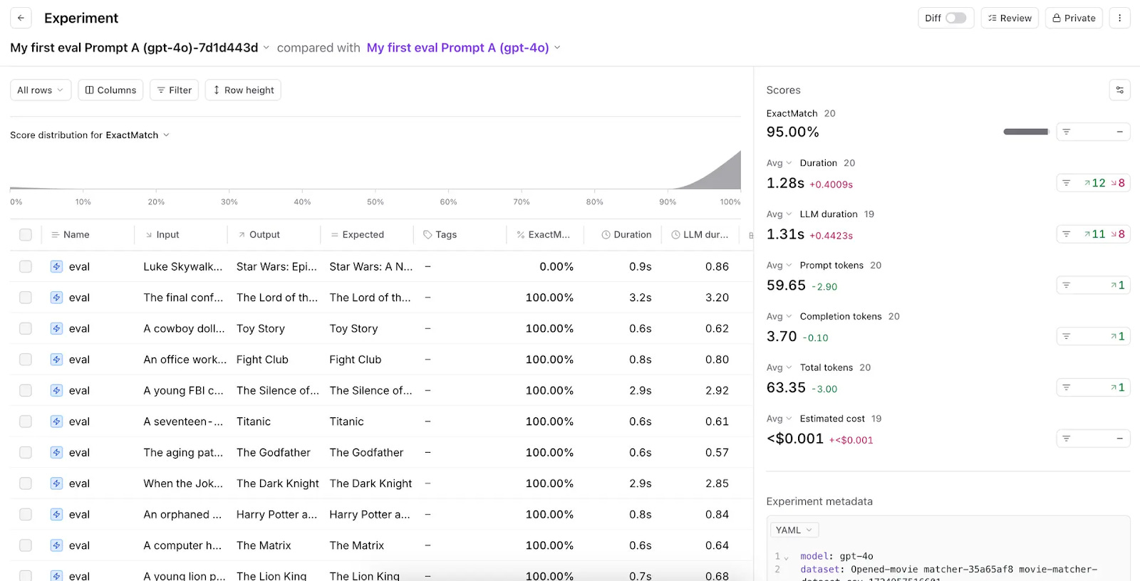 Here’s what a series of evals looks like in Braintrust. For each eval, you have the input, the expected output, the actual output, and then a score comparing the expected output to the actual one.