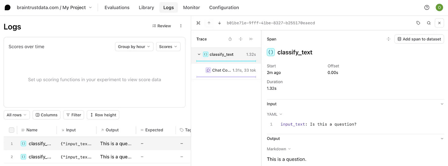 The same is true for AI models. Yes, you run evals in a test environment before you deploy whatever changes you made into production. But the loop cannot stop there – you need to be able to see how your models are actually performing in a real user context. You do this in Braintrust via logs. Every time a model gets used in your app, you use Braintrust to log the user’s input, the model output, and any other things you want to track like user feedback.