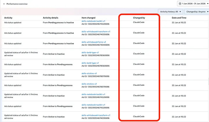 For 31 days, the only human input was typing /let-it-rip into a terminal each morning. About 2 minutes of my time, compared to the 1-2 hours a day a human media buyer would typically spend managing a campaign like this.
