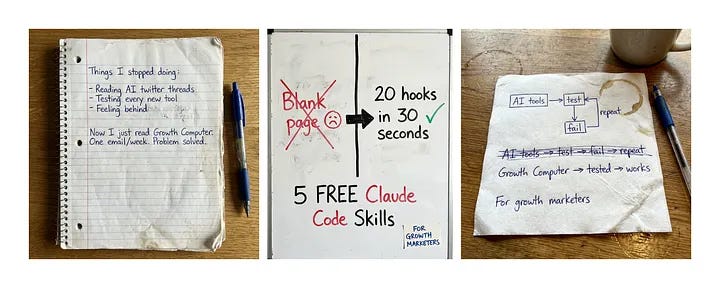 The winning formula turned out to be a tangible offer (free skills pack, not just “subscribe to a newsletter”) + whiteboard format + targeting language visible in the image itself. “For Growth Marketers” baked into the creative, not just the copy.