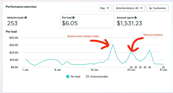 After 21 days of hands-off operation, I made one manual change and added business email validation to the lead form on the website. Work emails only, seemed reasonable enough.