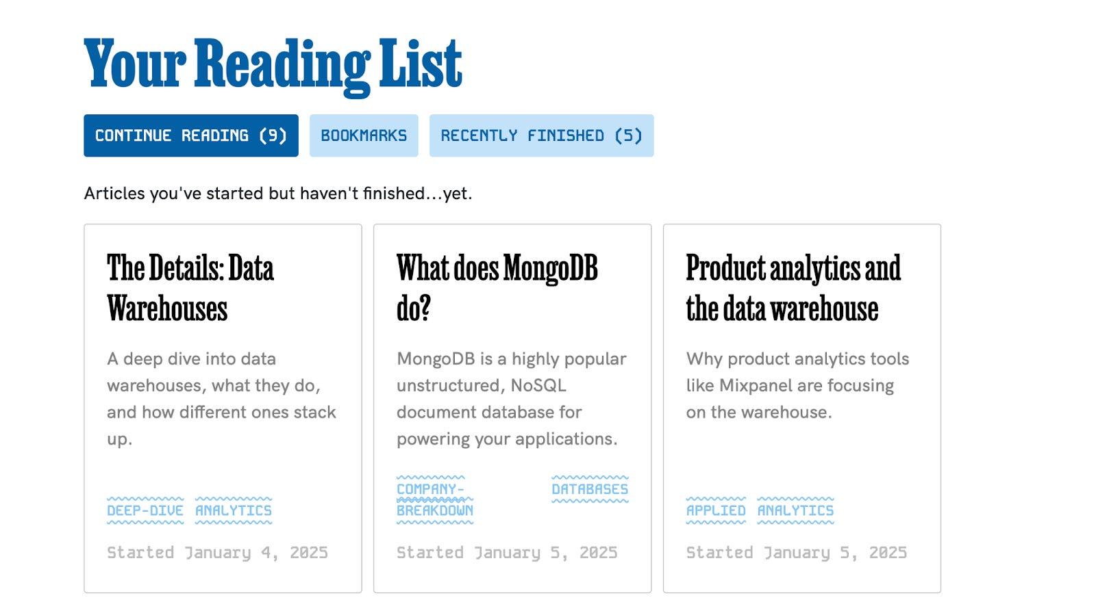 Your account page has a reading list, which tracks all of your activity. You can pick up where you left off, see what you’ve already finished, or check out that bookmark: