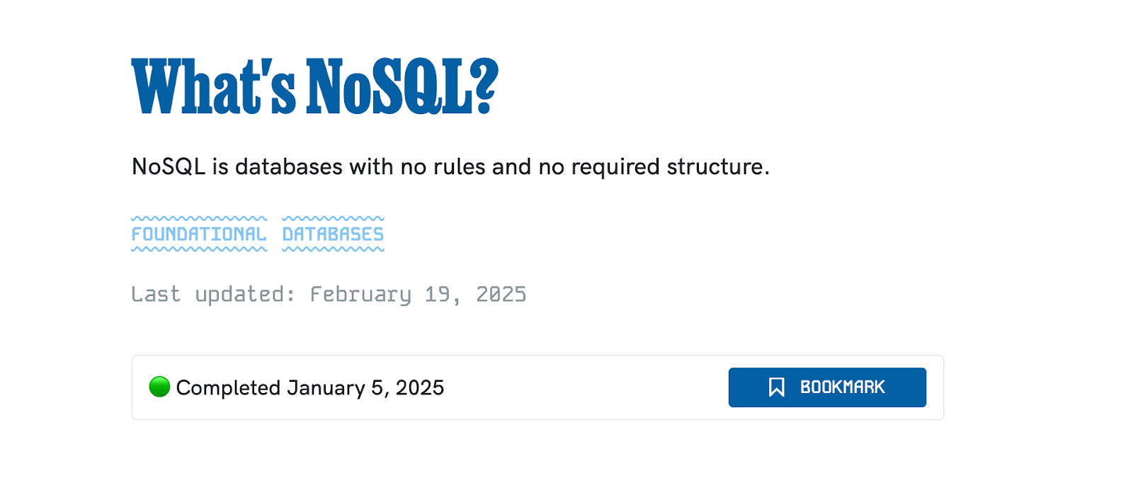 Knowledge bases organize everything you need to know into a straightforward, sequential learning track. We automatically keep track of what you’ve started, finished, or haven’t seen yet.