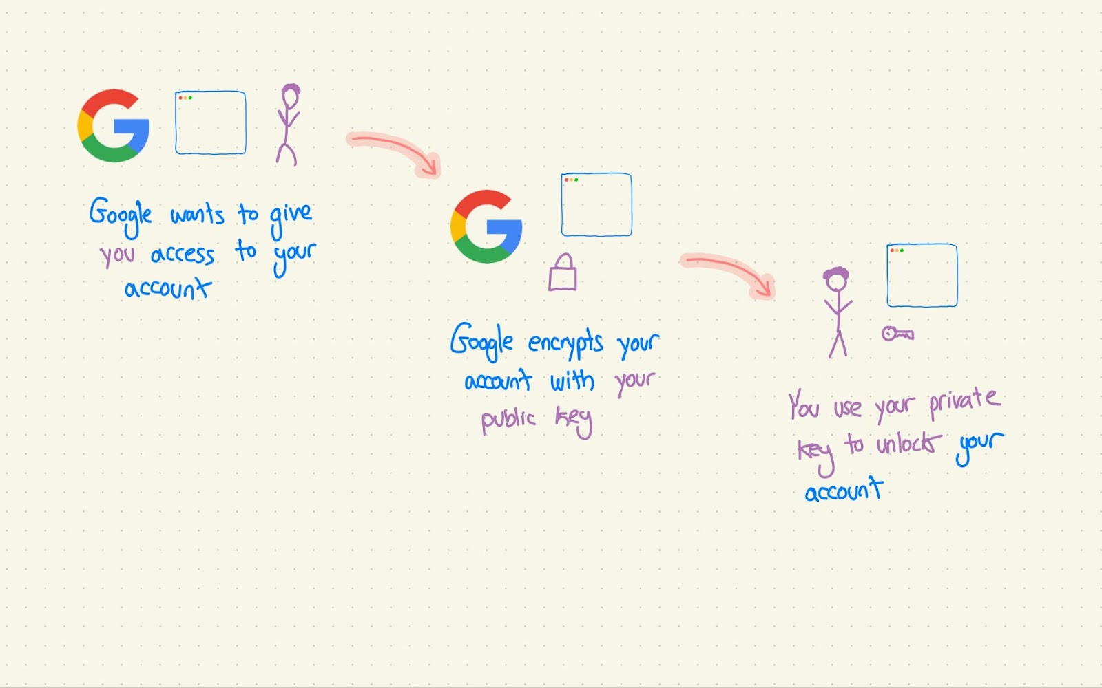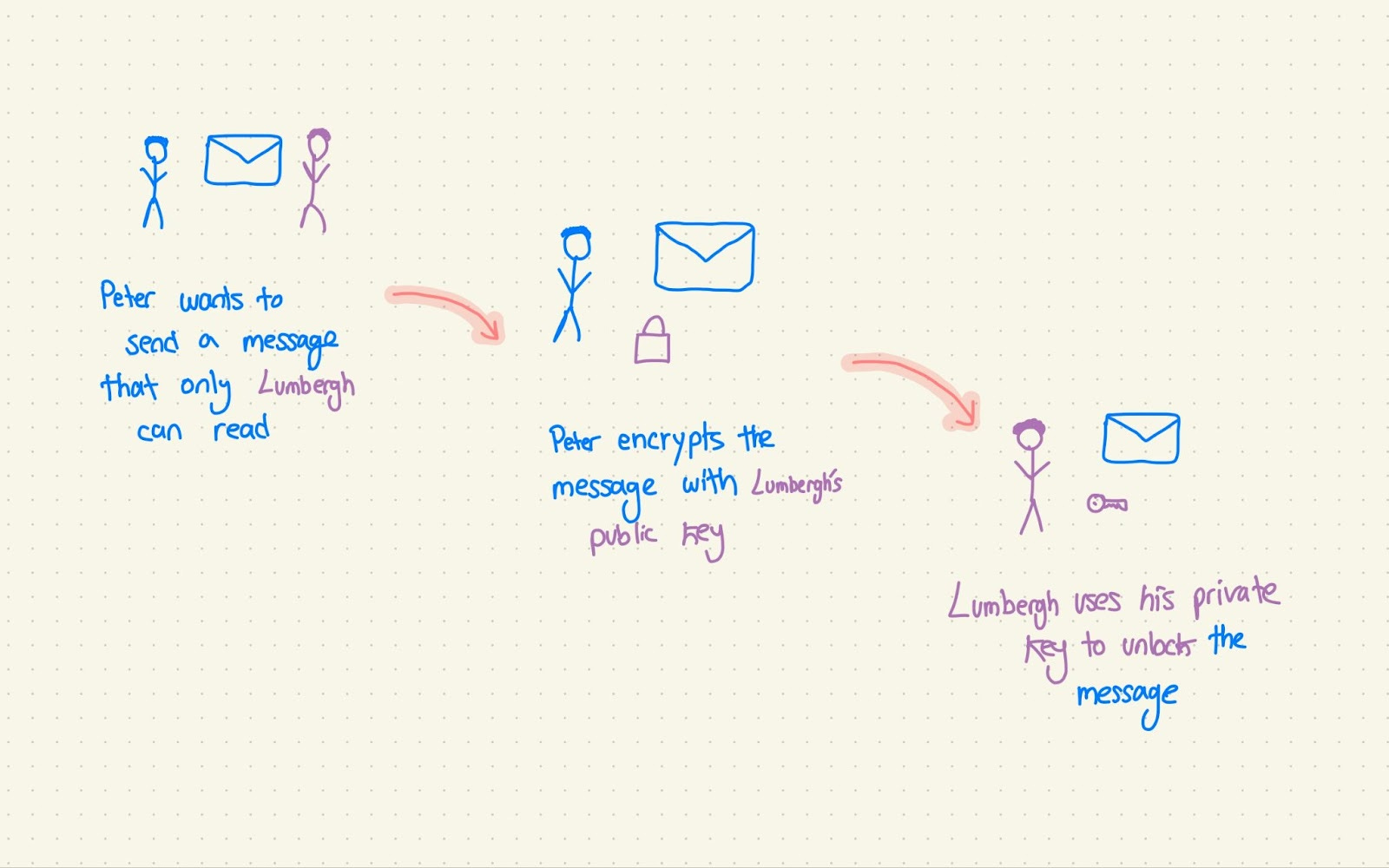 If someone wants to send a message to you (and only you), they’ll “lock” the message with your public key (remember, everyone has access to that). But only your private key can “unlock” something locked with your public key, so nobody else can access it. You can almost think of your public key as a locked door that anyone can put things behind, but only you can access those things. This process is classically explained with two people named Alice and Bob (boring):