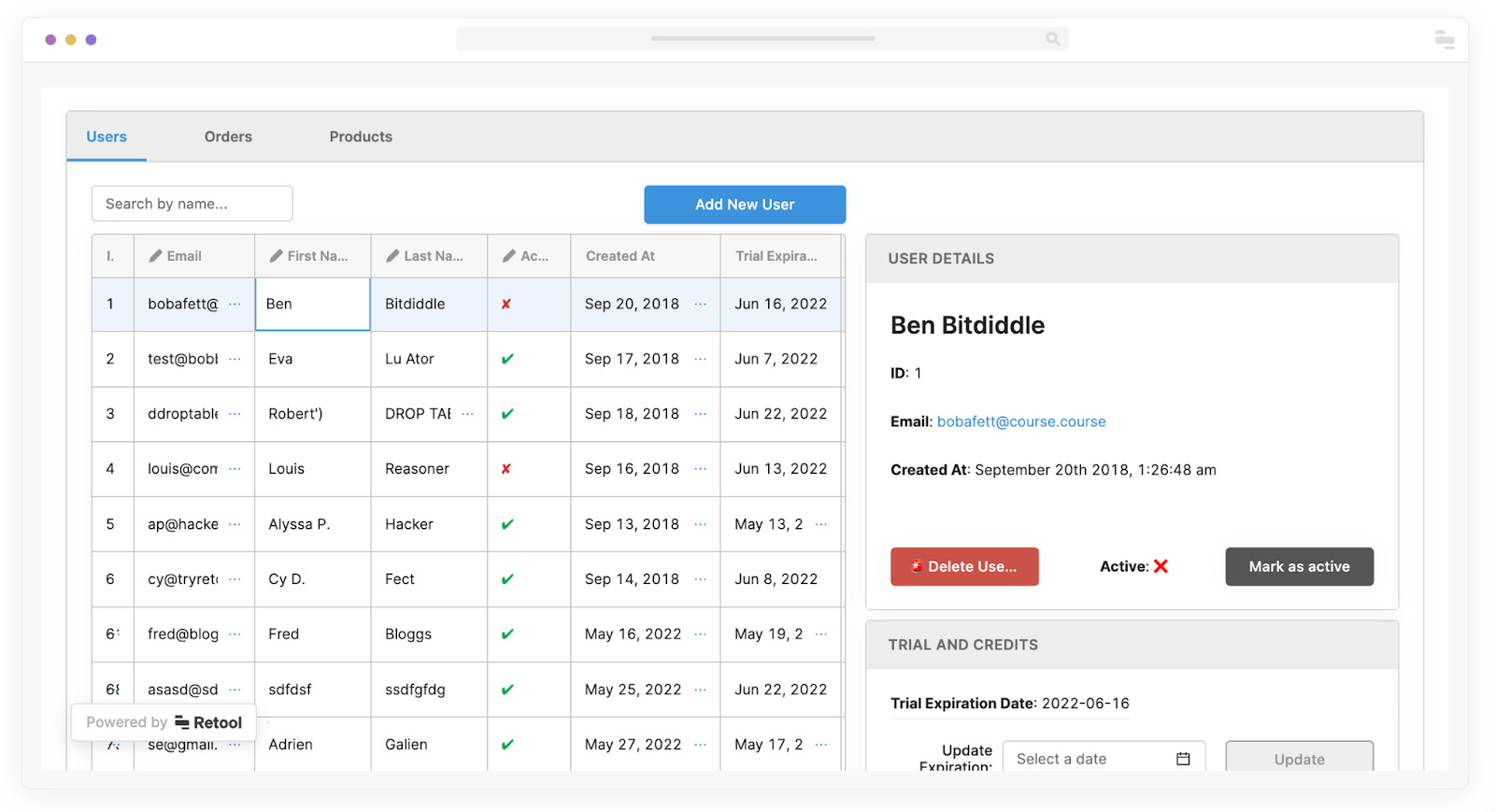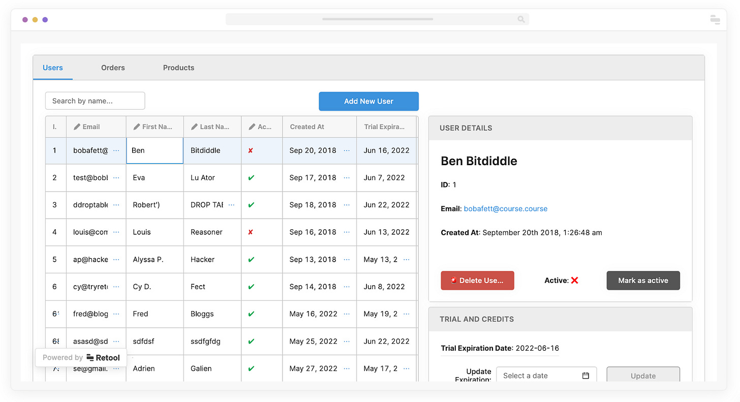An admin panel is an internal frontend that lets your team members interact with your app’s database, usually to accomplish operational tasks like refunding orders, fixing bugs, changing profile information, seeing up to date sales numbers, etc. Here’s an example of an admin panel that lets a support team view and search users and orders, add a new one to the database, and edit their information: