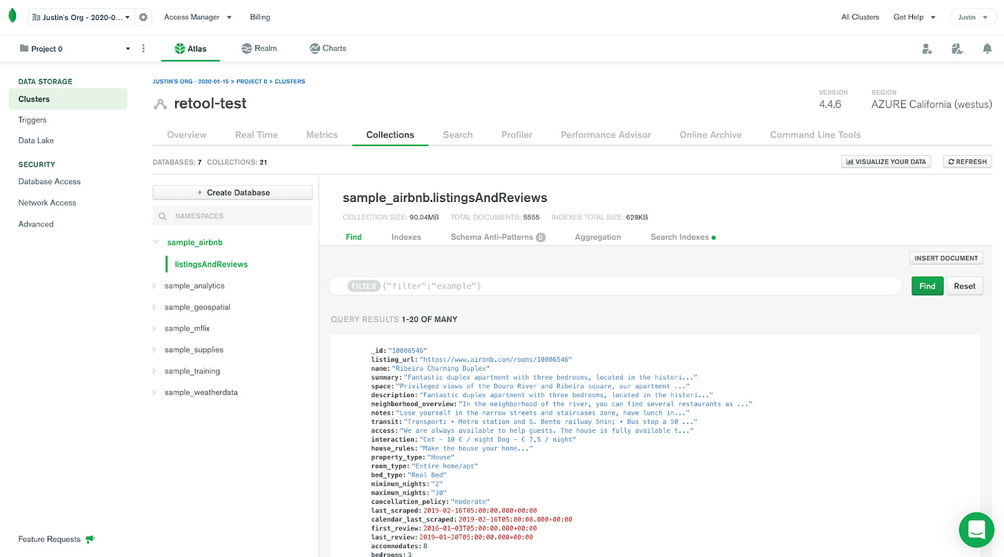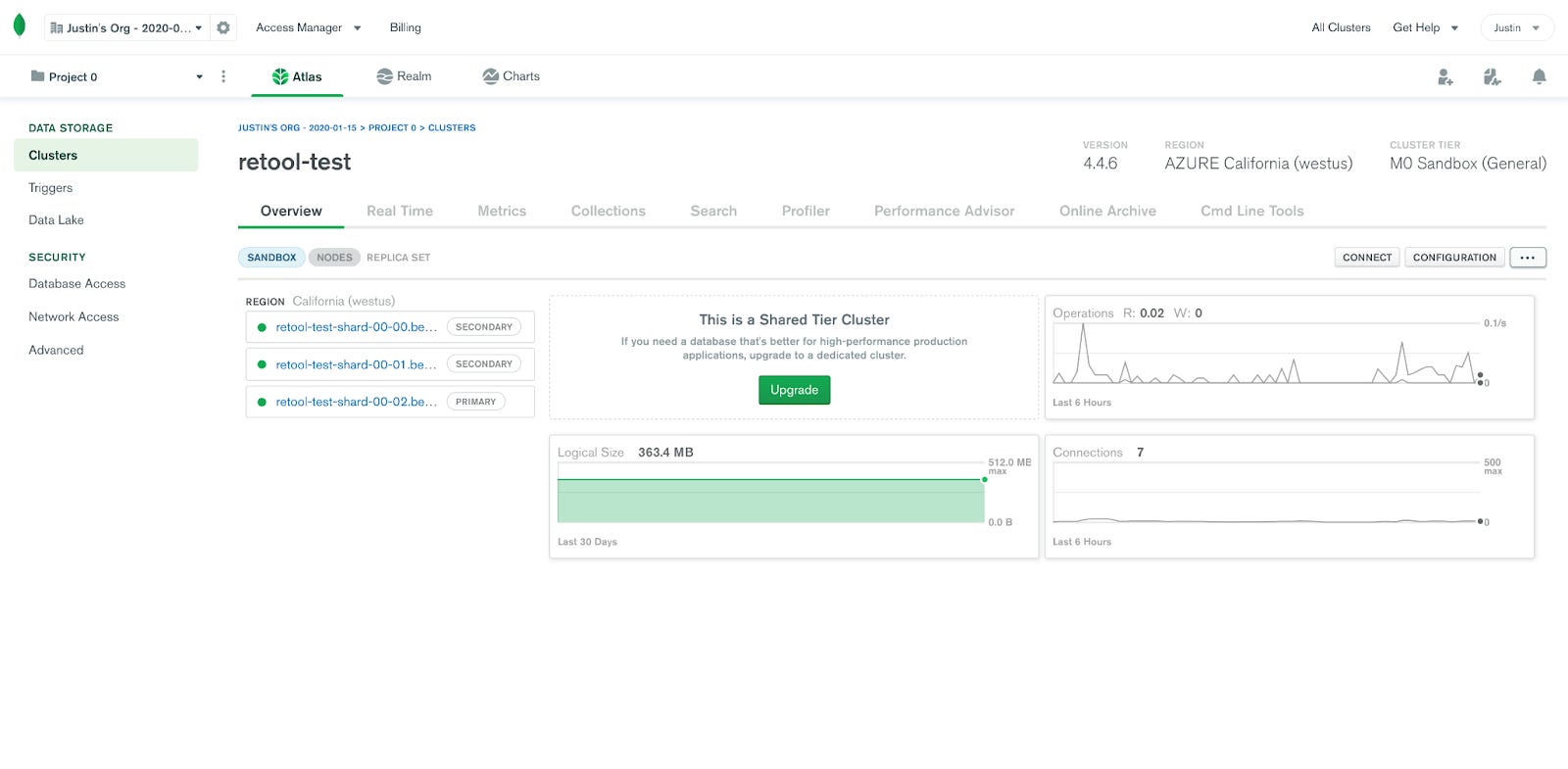 Atlas gives you a lovely management console on the web for interacting with your MongoDB data. Here’s an overview of a test cluster I set up for work: