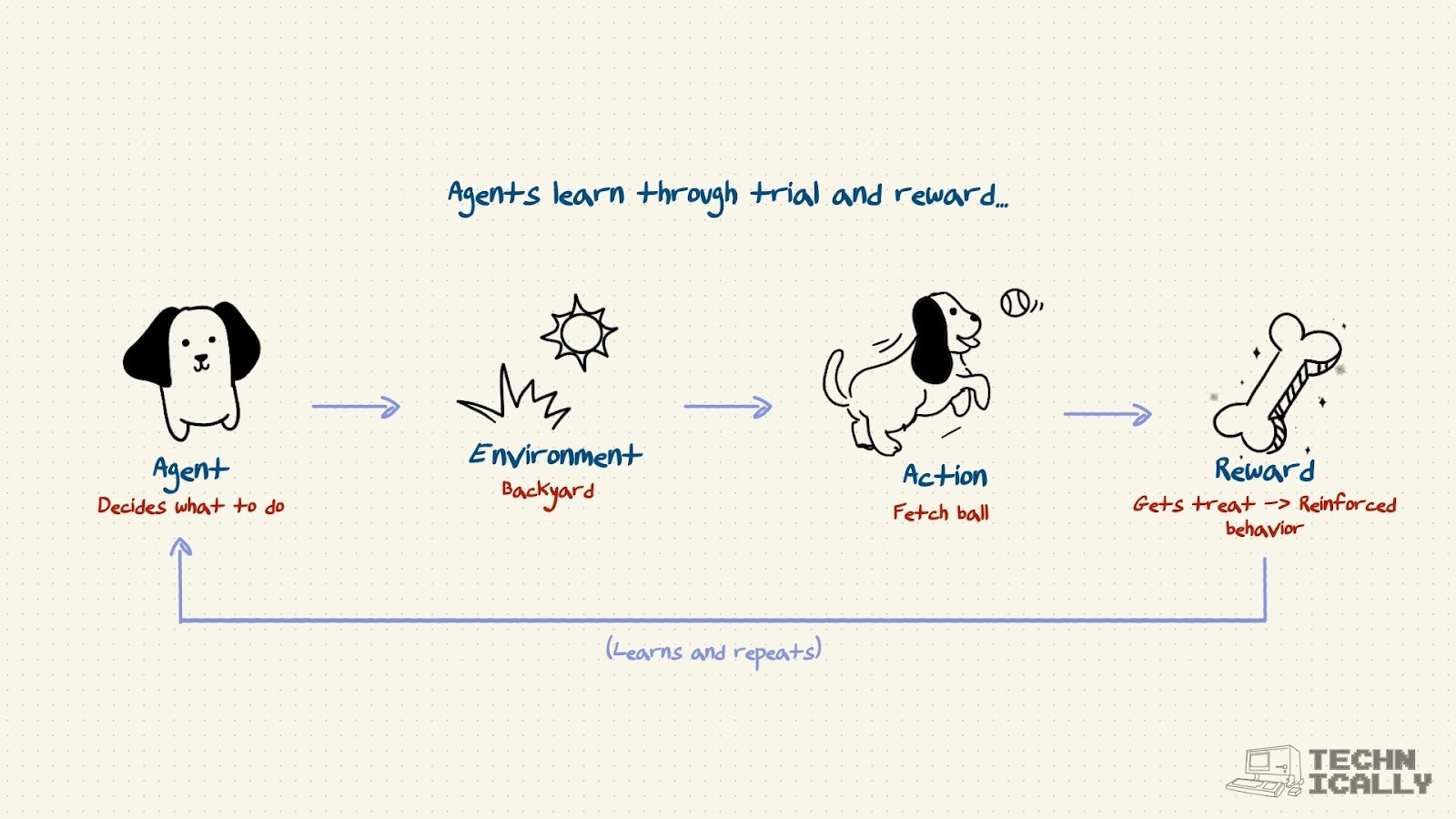 The easiest way to understand this is to think about training a dog. Imagine you’re teaching your new puppy (not a Doodle, please god) to fetch.